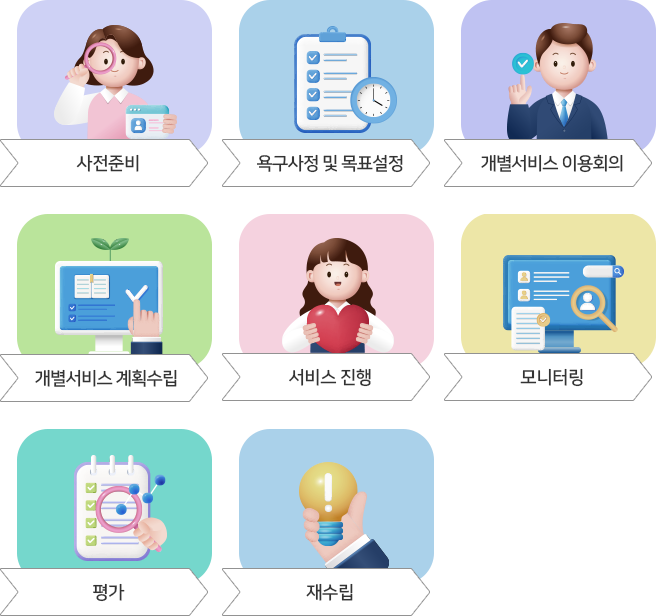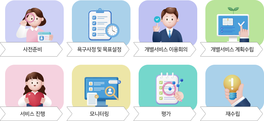 이용인의 욕구와 강점, 목표를 반영한 개별지원계획을 수립하여 각 개인이 지향하는 삶을 실현할 수 있는 맞춤형 서비스를 제공합니다. 생활, 건강, 사회참여, 정서지원 등 영역 별 목표를 세우고 담당자와 함께 주기적으로 점검하여 개인의 지속적인 성장을 지원합니다